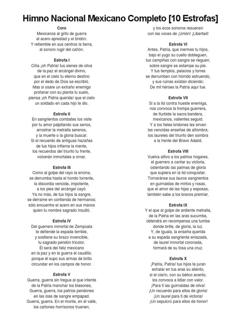 Esta compuesta por 45 versos, pero solo pondremos el ejemplo del coro, la i y la iv. So please help us by uploading 1 new document or like us to download El himno nacional mexicano fue escrito por francisco gonzález bocanegra y música de jaime nunó. ¡solo aquí tienes el himno nacional mexicano completo para imprimir! La letra oficial del himno nacional es el siguiente:mas si osare un extraño enemigo profanar con su planta tu suelo, piensa ¡oh patria querida!